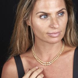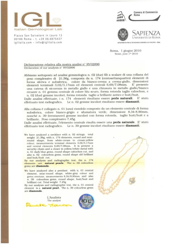 realizzata a doppio filo di perle naturali digradanti di mm 7-3 circa, fermatura in oro e argento impreziosita da uno zaffiro centrale taglio cabochon e due diamanti taglio vecchio per ct 0.20 circa, lungh. cm 40, gr. 21. Corredato di certificato IGL del 1/06/2010 attestante le caratteristiche delle perle.