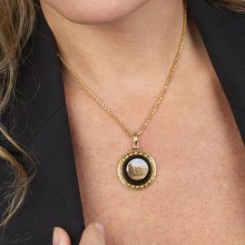 in oro giallo 18kt, di forma circolare, con micromosaico in onice (difetti) raffigurante il Colosseo, con catena di lunghezza cm 39.5, punzone 750, dim. cm 2.6x 2.7 circa, gr. 16