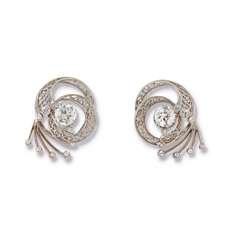 in oro bianco 18kt, impreziosite da due diamanti taglio vecchio per ct 3.20 circa e diamanti taglio vecchio per ct 0.20 circa, dim. cm 2,5x3 circa, gr. 12 complessivi