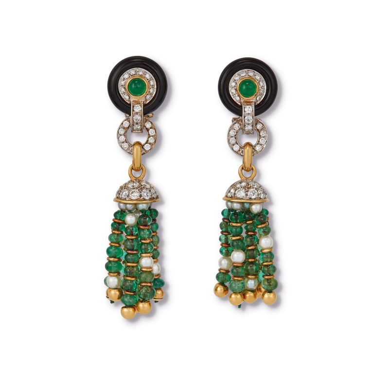 in oro giallo e bianco 18kt, con diamanti taglio brillante per ct.1.50 circa, smeraldi taglio cabochon e sfera, dischi di onice, sfere di perle, chiusura a clip, punzone 750 e del fabbricante, dim. cm 5.5x1.4, gr. 30