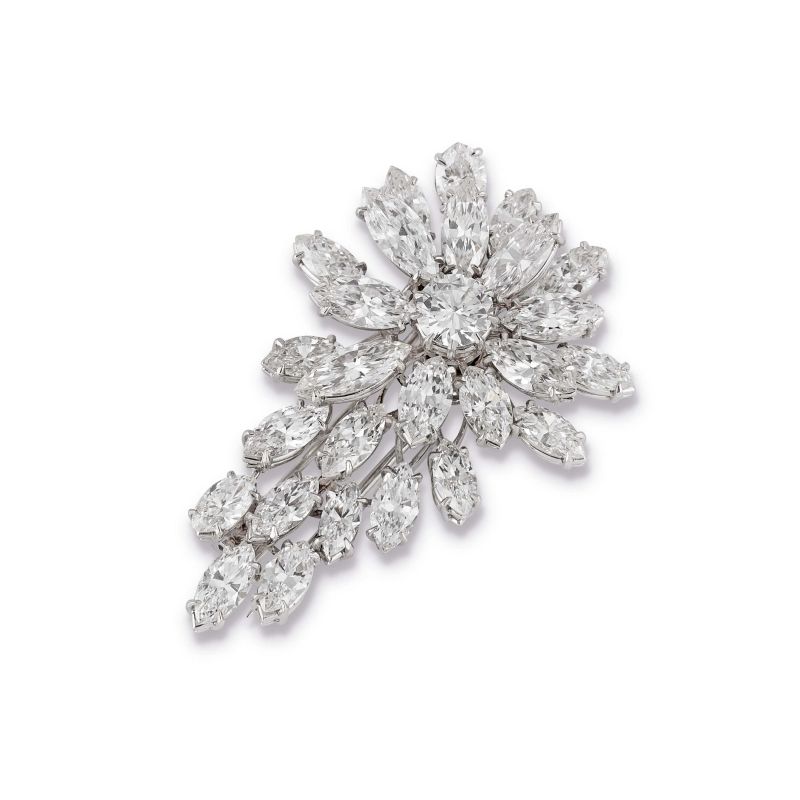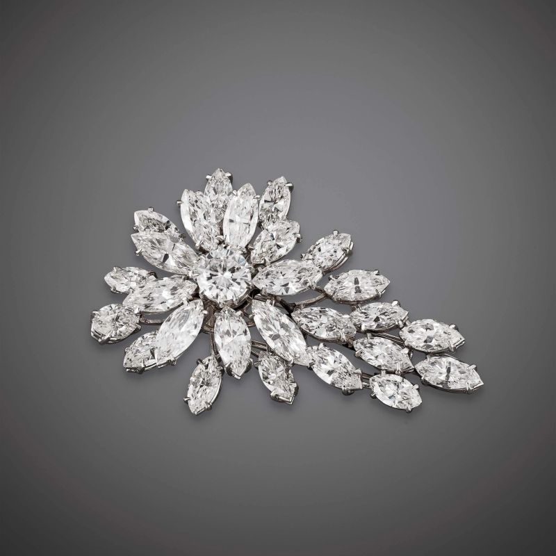 in oro bianco 18kt, impreziosita da 26 diamanti taglio navette per ct. 12 circa e da un diamante taglio brillante per ct. 1,20 circa, dim. cm 5 x 3.5, gr. 23. Corredato da perizia Gioielleria Pederzani.