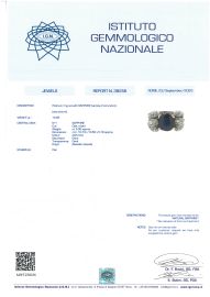 in platino, al centro uno zaffiro taglio ovale di ct 5.30 circa, con diamanti laterali taglio antico e huit huit ct 1.30 circa, punzone pt, mis 18/58, gr. 10. Corredato di certificato IGN del 23/09/2025 attestante le caratteristiche dello zaffiro e l'assenza di trattamenti termici.