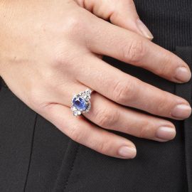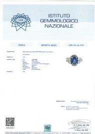 in oro bianco 18kt, al centro uno zaffiro taglio ovale di ct. 3.50 circa, con diamanti taglio brillante per ct. 1.20 circa, punzone 750, mis. 16/56, gr. 7. Corredato di certificato IGN del 8/07/2025 attestante le caratteristiche.