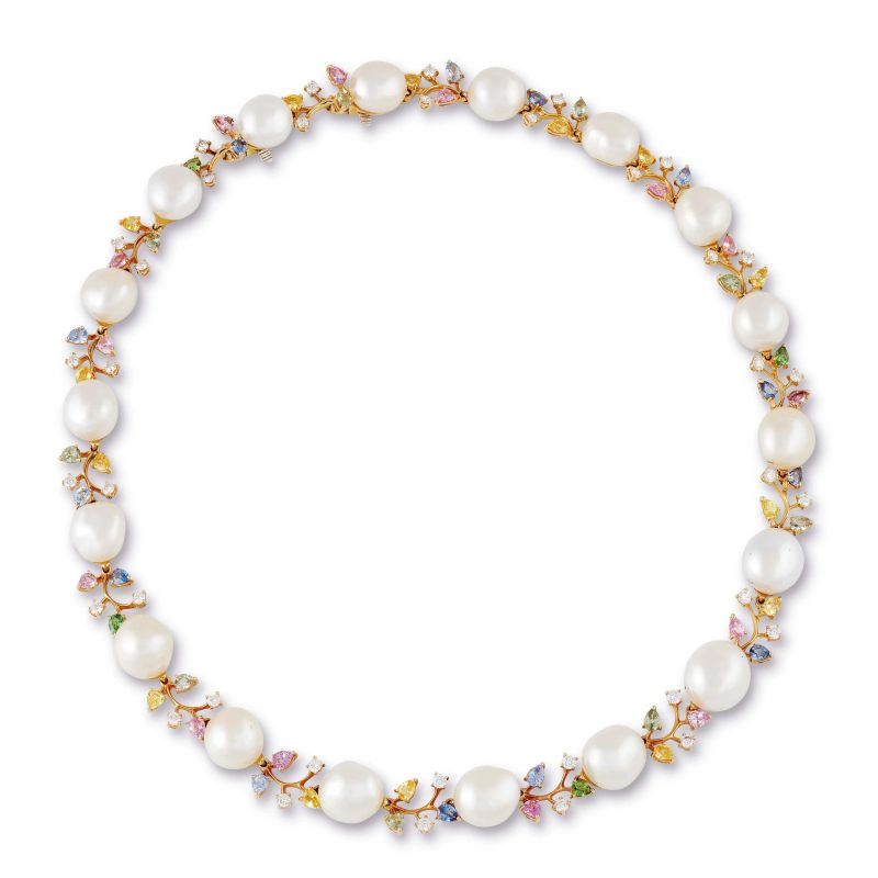 in oro giallo 18kt, composta da una serie concatenata di tralci e perle di acqua dolce, con zaffiri multicolore e diamanti taglio brillante per ct.1.80 circa, firmata Schoeffel, punzone 750, lungh. cm 42, predisposizione per regolare la lunghezza, gr. 54