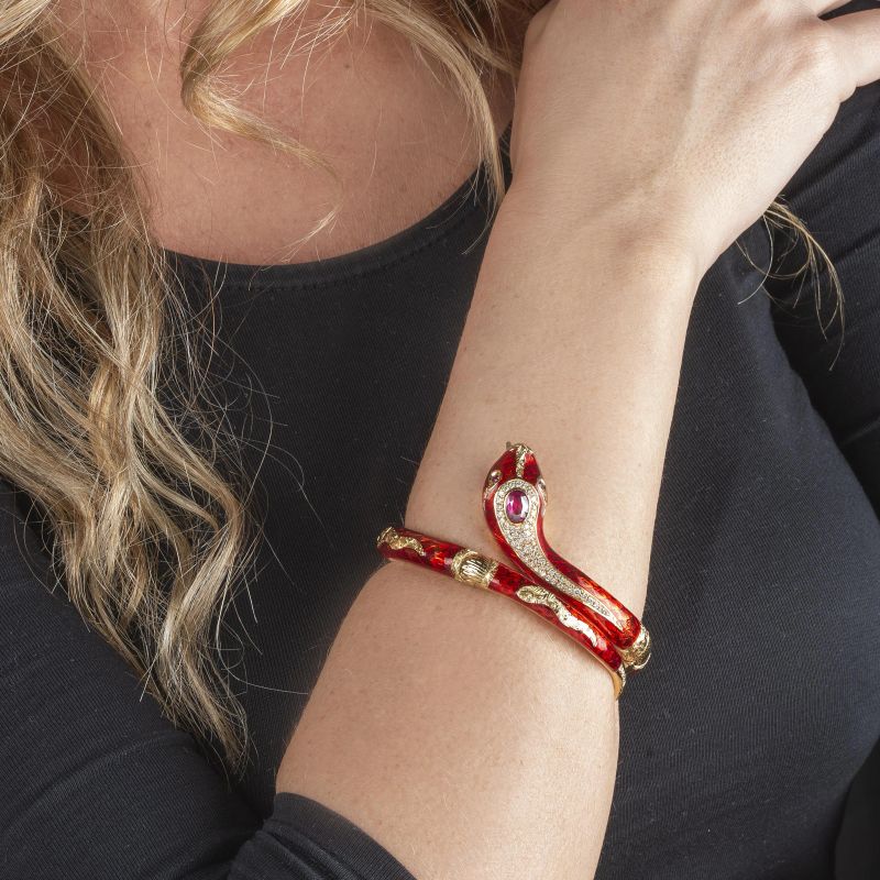 in oro giallo 18kt, decorato in smalto rosso, impreziosito da un rubino centrale taglio ovale ct. 1.50 circa e diamanti taglio brillante per ct 1.50 circa, punzone 750 e del fabbricante, dim. cm 6.5x3.2, gr. 62