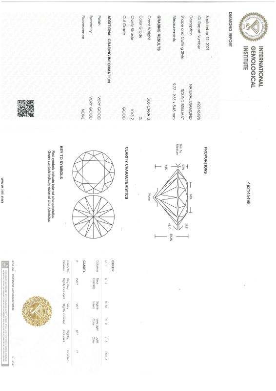 in oro bianco 18kt, diamante taglio brillante di ct. 3.06, colore G, purezza Vvs2, punzone 750, mis. 13/53, gr. 4. Corredato di certificato IGI del 12/09/2021 attestante le caratteristiche.