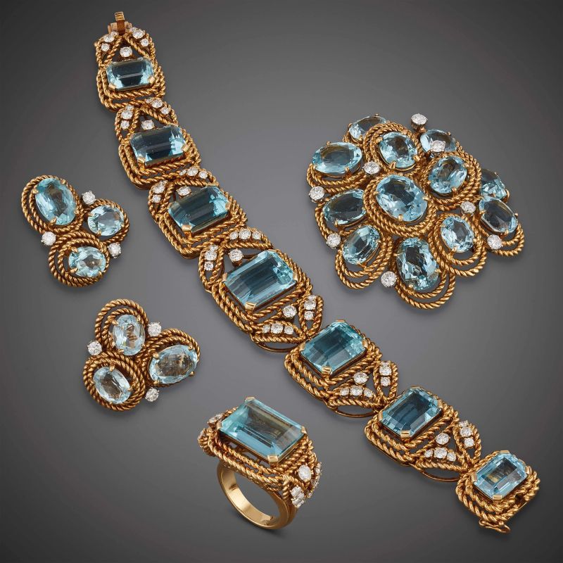 in oro giallo 18kt, composta da spilla, paio di orecchini, bracciale e anello. Bracciale impreziosito da acquemarine per ct. 45 e diamanti taglio brillante per ct. 2.80 circa. Orecchini con acquemarine per ct. 12 e diamanti taglio brillante per ct.0.60 complessivi, chiusura a clip. Anello al centro un'acquamarina di ct. 8 circa e affiancata da diamanti taglio brillante per ct. 0.80 circa. Spilla composta da acquemarine per ct. 30 circa e diamanti taglio brillante per ct.1.30 circa, firmati Van Cleef, punzoni francesi dell'oro, marchio del fabbricante e numeri di seriali, lungh. bracciale cm 17.5, dim. spilla cm 5.1x4.5, mis. anello 8/48, dim. orecchino 2.6x 2.5, gr. 138