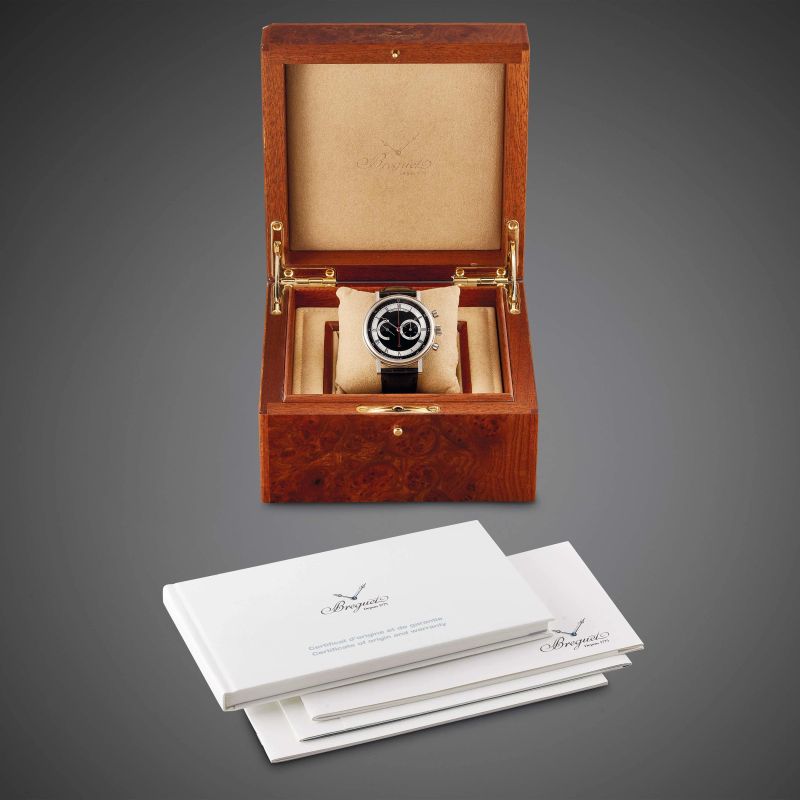 cassa in oro bianco 18kt, fondello con movimento a vista, tasti del crono a pompa, corona marcata, quadrante guillochè nero/argentè con grafica a contrasto, due contatori, secondi a ore nove, numeri romani, movimento a carica automatica cal 533.3 n. 0003778, cinturino originale in pelle nera con fibbia deployant in oro bianco marcata Breguet, vetro minerale, gr. 130. Diam. mm 43. Corredato di scatola e garanzia.
