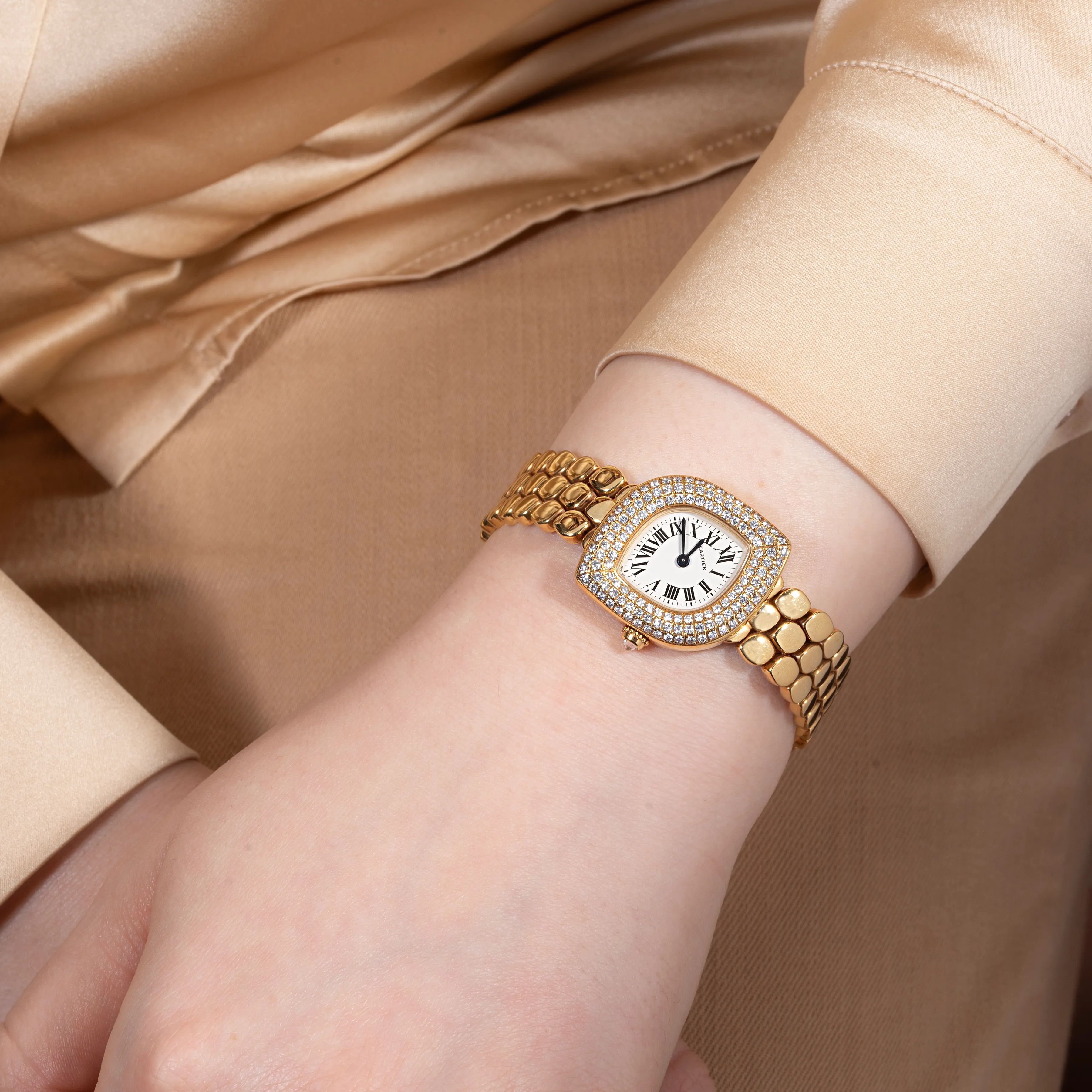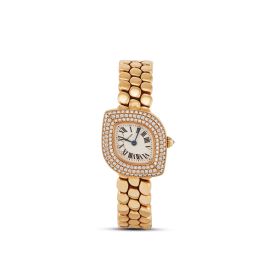 cassa di forma in oro giallo 18kt, fondello serrato con viti, corona con diamante, lunetta impreziosita da tre file di diamanti, quadrante color avorio, numeri romani a smalto, movimento al quarzo, bracciale a maglie navette in oro giallo 18kt con chiusura doppia deployant marcata Cartier, lungh. interna cm 18, vetro minerale, gr. 68. Dim. mm 24x25. Corredato di scatola.