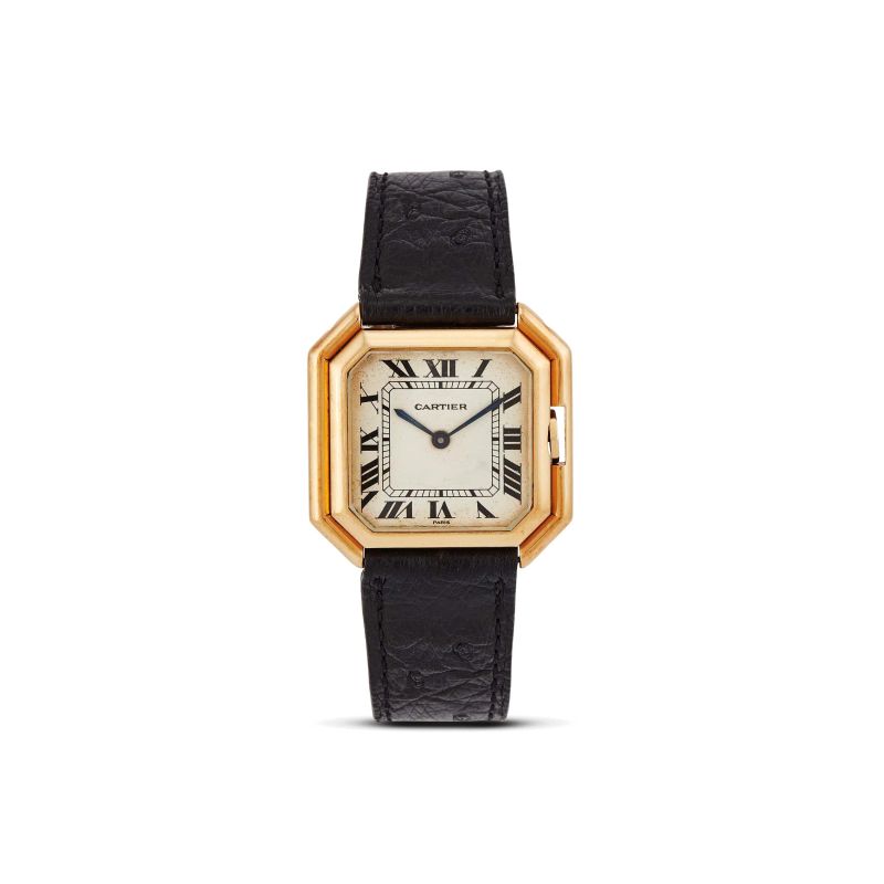 cassa di forma in oro giallo 18kt, fondello serrato con viti, lunetta a scalino, corona entro alloggio (difetti), quadrante bianco, grafica nera, numeri romani a smalto, movimento a carica automatica, cinturino in pelle nera con fibbia in oro non originali, vetro minerale, gr. 40. Dim. mm 31x31