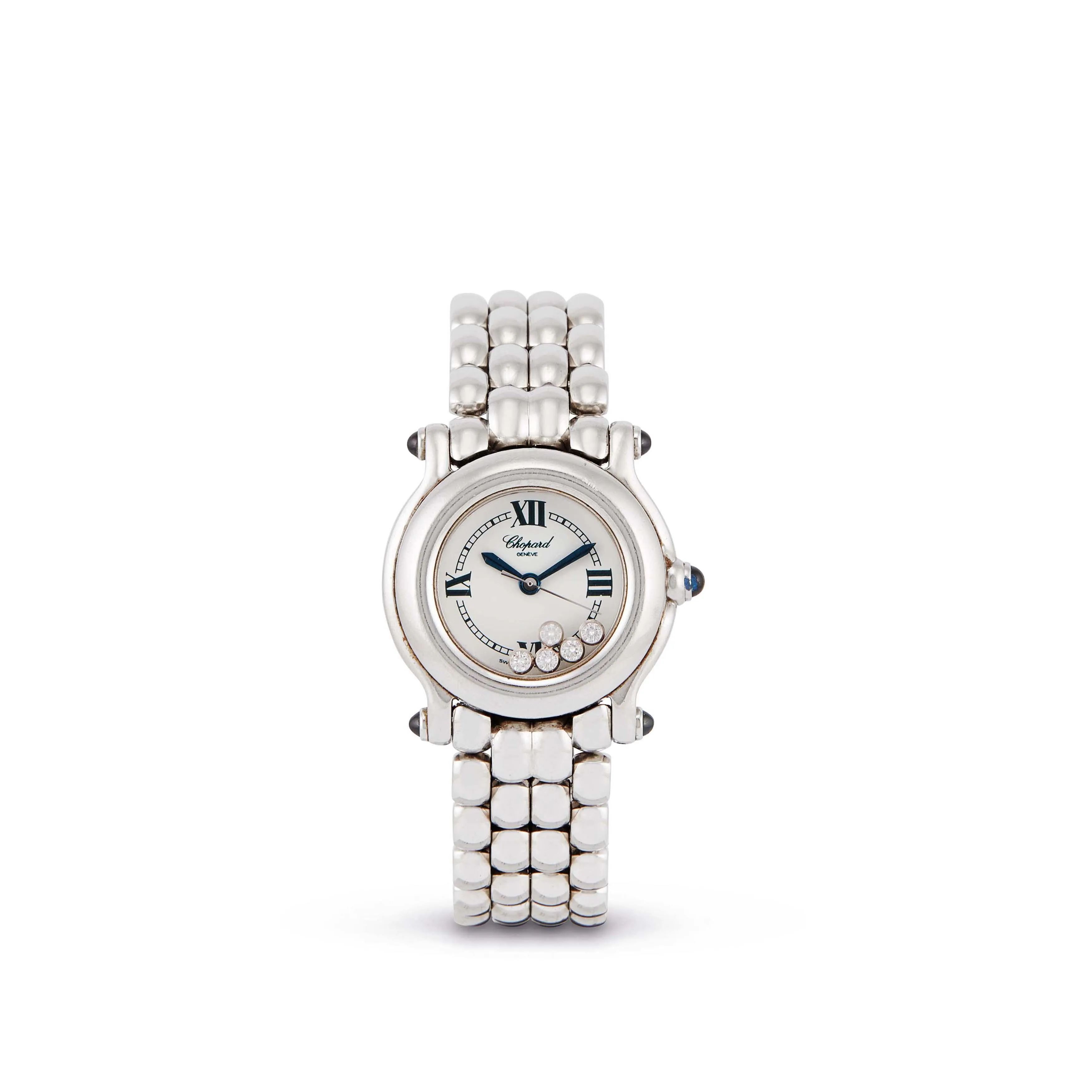 cassa in acciaio, fondello serrato con viti, corona e anse sagomate con pietre cabochon blu, lunetta a scalino, quadrante bianco con diamanti fluttuanti, grafica nera, numeri romani, movimento al quarzo, bracciale a maglie in acciaio, lungh. interna cm 17 circa, chiusura doppia deployant a scomparsa marcata Chopard, vetro minerale. Diam. mm 26. Corredato di scatola, quattro maglie aggiuntive e secondo cinturino in pelle blu con fibbia marcata Chopard.