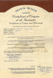 cassa tonneau in acciaio, fondello serrato con viti, lunetta a scalino, corona marcata, quadrante argentè guilloché, grafica nera, grandi numeri arabi al superluminova, datario a ore sei, lancetta dei secondi a freccia, movimento a carica automatica, cinturino in pelle nera, fibbia in metallo marcata Franck Muller, vetro minerale. Dim. mm 34x50. Corredato di scatola e garanzia