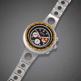 cassa monoblocco in acciaio, corona con logo Caribbean Shark, tasti del crono a pompa, ghiera girevole in bachelite di colore giallo e nero (lievi difetti) con scala tachimetrica a 300, quadrante nero, grafica argento, indici al trizio, tre contatori, secondi a ore nove, movimento a carica automatica, bracciale originale a maglie in acciaio con fori centrali, lungh. interna cm 18, chiusura a scomparsa in acciaio, vetro minerale, Diam. mm 48
