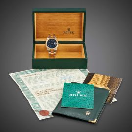 cassa in acciaio, fondello serrato a vite, corona marcata, ghiera zigrinata in oro giallo, quadrante blu, grafica oro, indici applicati con trizio, datario a ore tre con lente cyclope, movimento a carica automatica cal 3135 n. 5265192, bracciale oyster in acciaio e oro ref. 78353 finali 457B, lungh. interna cm 20 circa, chiusura a scatoletta in acciaio marcata Rolex, vetro minerale, gr. 100. Diam. mm 34. Corredato di scatola, garanzia, libretti e una maglia aggiuntiva.