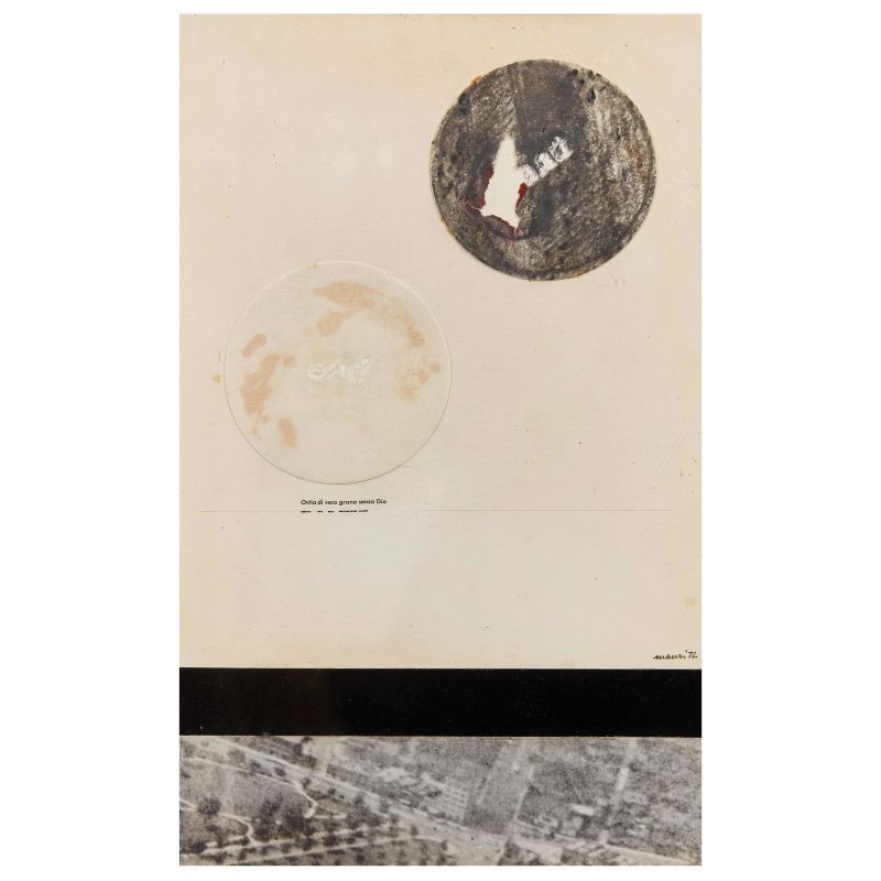 photograph, communion wafer, pencil, charcoal and transfer letters on paper