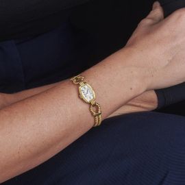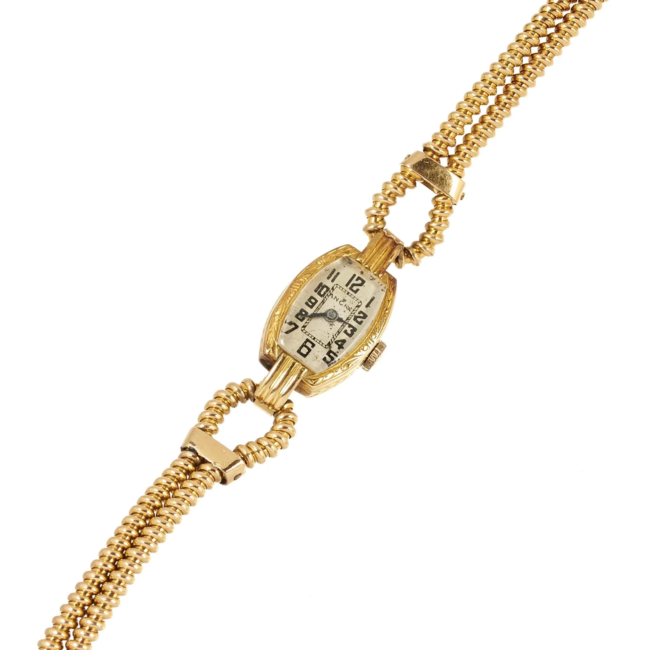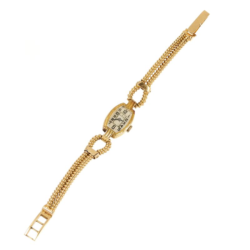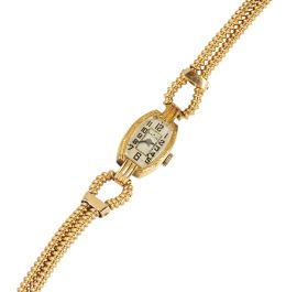 cassa di forma in oro giallo 18kt, fondello a pressione, lunetta e bordo inciso con motivi fogliacei, anse scanalate, quadrante argentè (difetti), numeri arabi a smalto, movimento a carica manuale, bracciale a cordicella in oro giallo con chiusura a scomparsa, gr. 22. Dim. mm 15x21