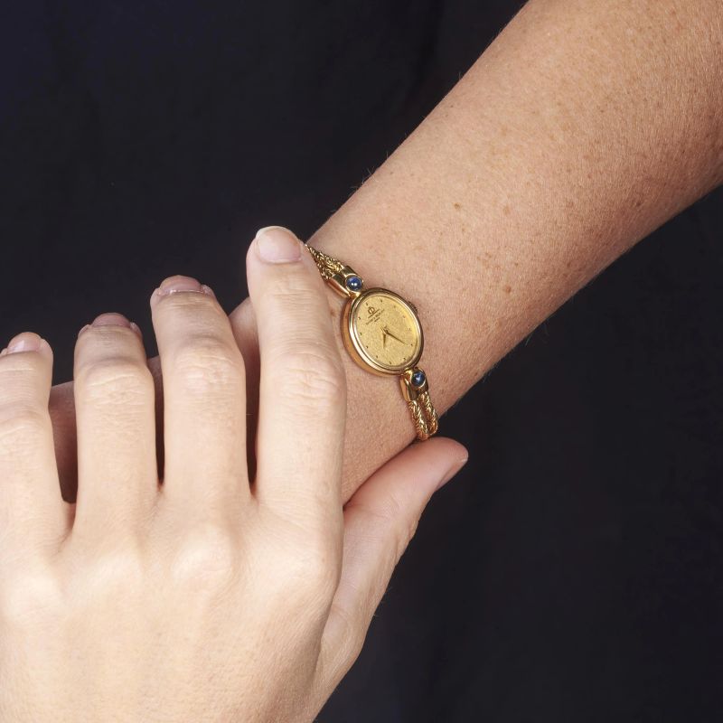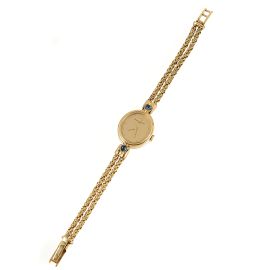 cassa di forma in oro giallo 18kt, fondello a pressione, anse sormontate da pietre cabochon blu, quadrante champagne, indici applicati, movimento a carica manuale BM777, bracciale a maglia torchon con chiusura in oro giallo 18kt, vetro minerale, gr. 26. Dim. mm 19x22