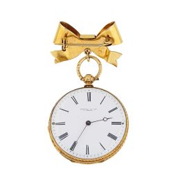 REYNAUD ET CIE SMALL YELLOW GOLD POCKET WATCH WITH BOW-SHAPED BROOCH