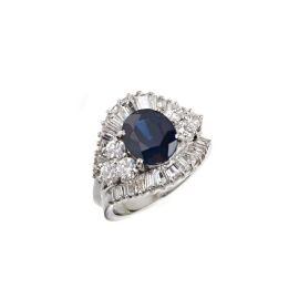 in oro bianco 18kt, impreziosito da uno zaffiro centrale di ct 3.50 circa, circondato da diamanti taglio brillante per ct 0.90 circa, diamanti taglio baguette e tapes per ct 1.60 circa, punzone 750, mis. 14/54, gr. 6
