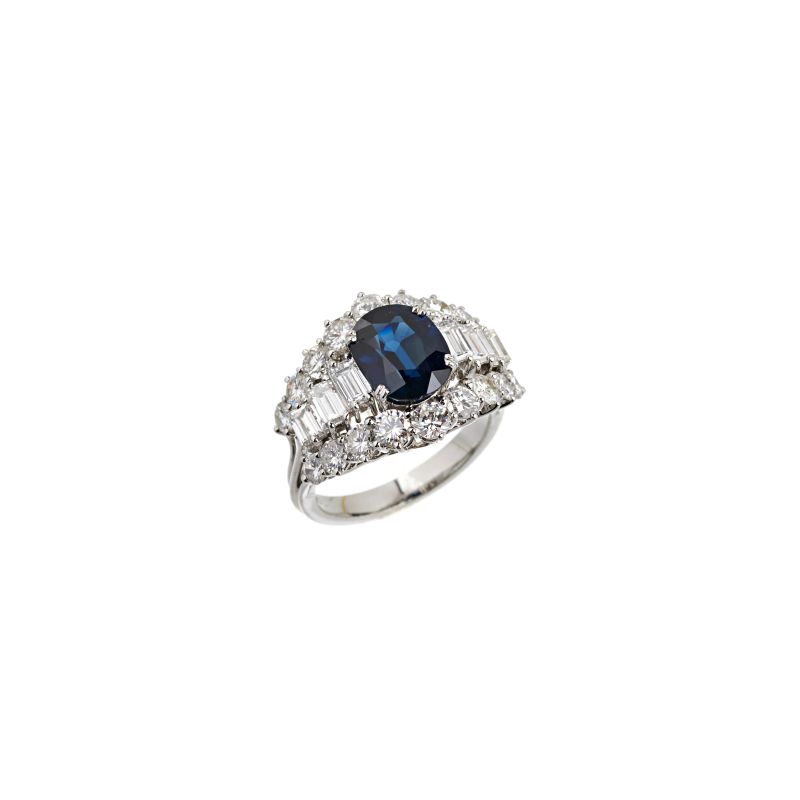 in oro bianco 18kt, impreziosito da uno zaffiro centrale taglio ovale di ct 3.10 circa, circondato da diamanti taglio brillante per ct 2.10 circa e diamanti taglio baguette per ct 1.10 circa, punzone 18kt, mis. 14/54, gr. 6