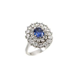 in oro bianco 18kt, impreziosito da diamanti taglio brillante per ct. 1 circa e zaffiro centrale di forma ovale sfacettato per ct. 1,20 circa, punzone 750 e del fabbricante, mis. 13/53, gr. 6
