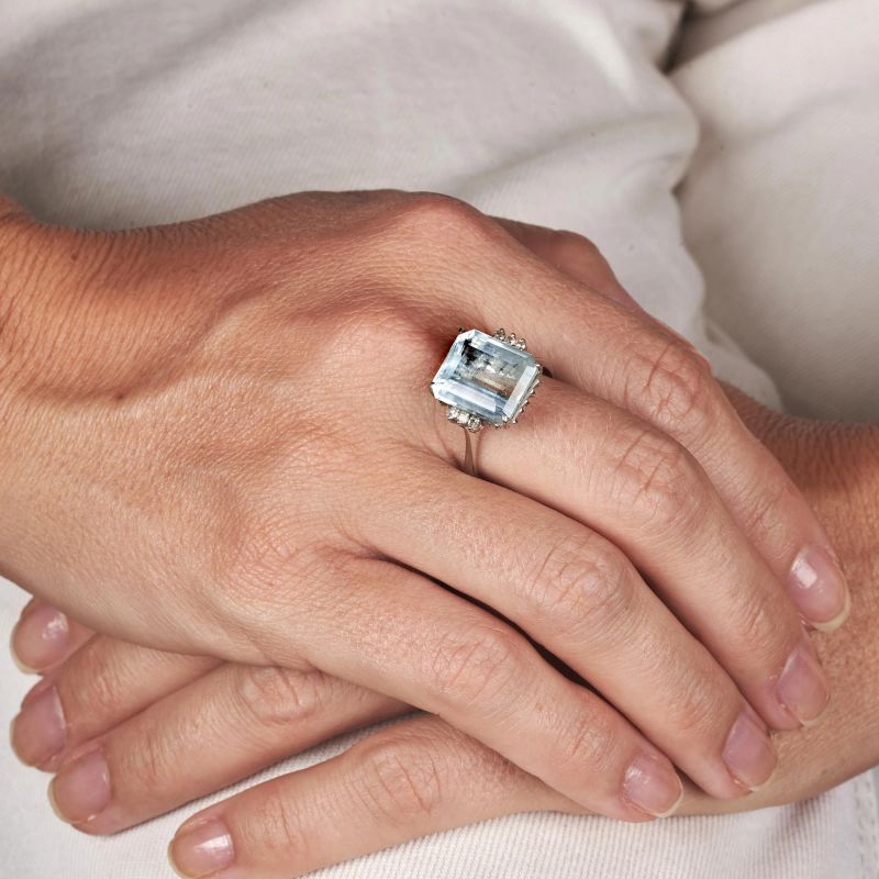 AQUAMARINE AND DIAMOND RING IN 18KT WHITE GOLD