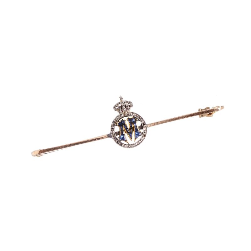 in oro e argento, impreziosita da rose di diamante e zaffiri calibrati, lungh. cm 6, gr. 3