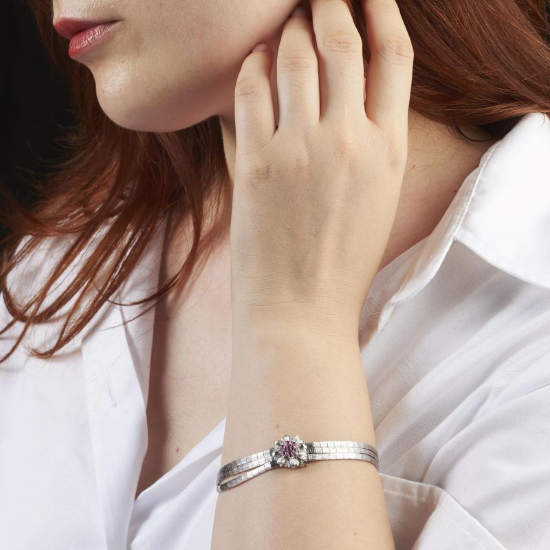 in oro bianco 18kt, impreziosito da chiusura a forma di fiore e piccoli rubini sfaccettati, punzone 750, cm. 19,5, gr. 23