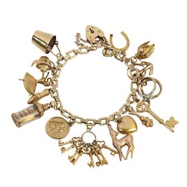 in oro 9kt, realizzato a catena con vari ciondoli di varie forme e misure, punzoni inglesi, circonferenza cm 17 circa, corredata di catena di sicurezza, gr. 32