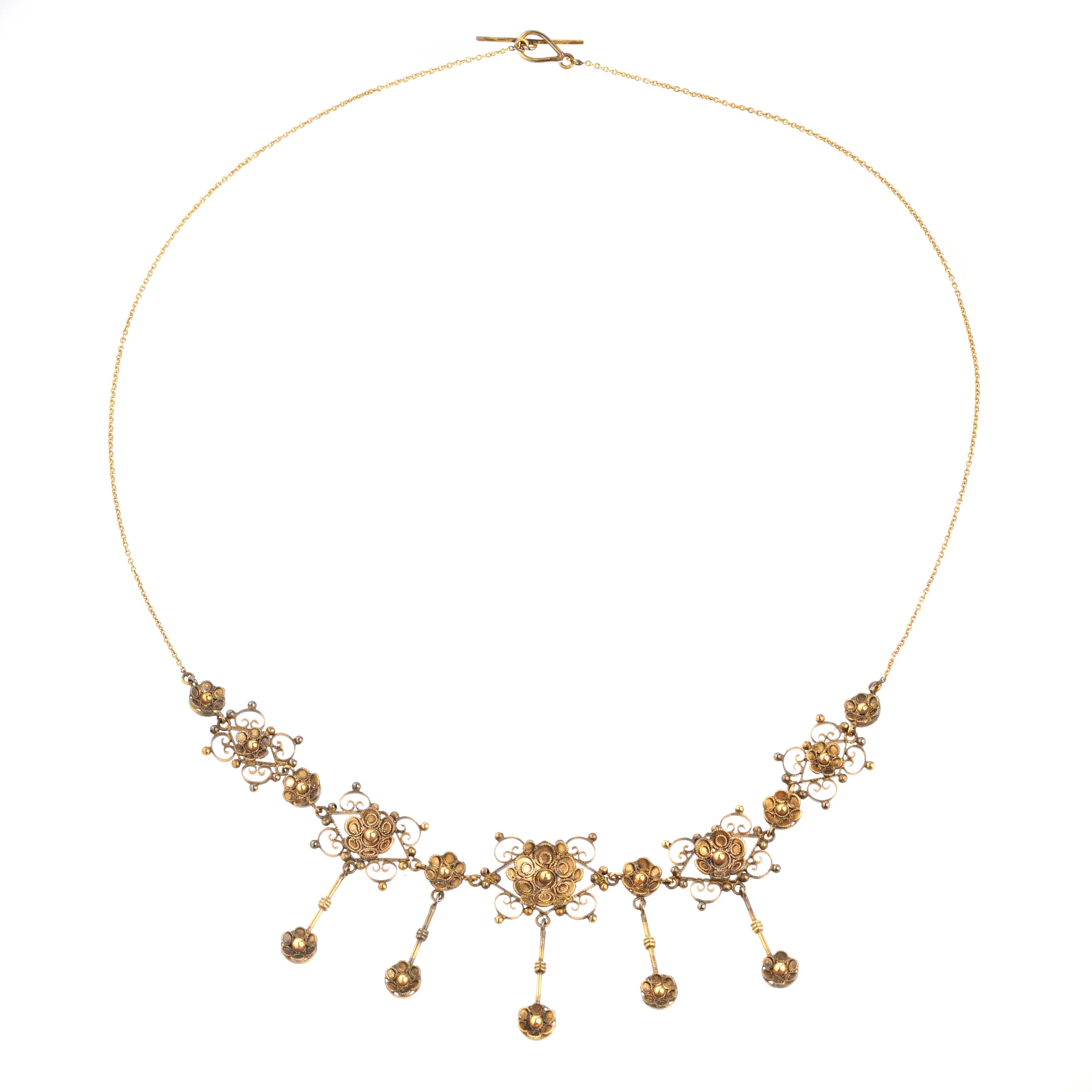 in oro 9kt, elementi pendenti lavorati in filigrana raffiguranti fiori stilizzati, lungh. cm 41, gr. 6