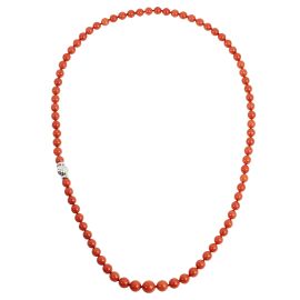 realizzata ad un filo di boules in corallo leggermente digradanti di mm 11-8 circa, fermatura in oro bianco 18kt con diamanti taglio brillante, punzoni 750 e del fabbricante, lungh. cm 72, gr. 68