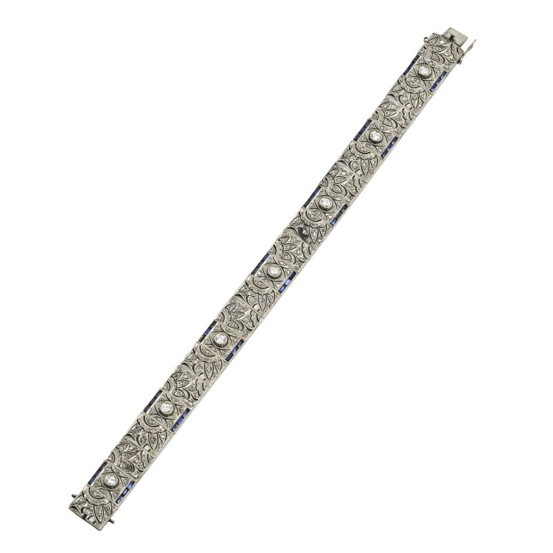 in oro bianco 18kt, composto da una serie di maglie rettangolari concatenate con motivi floreali traforati, impreziosito da diamanti taglio brillante per ct 0.50 circa, zaffiri calibrati (due mancanti) e rose di diamante, lungh. cm 18,5, gr. 25