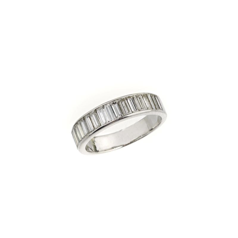 in oro 14kt, impreziosito da una fila di diamanti taglio baguette per ct 1.30 circa, punzone 585, mis. 14/54, gr. 4
