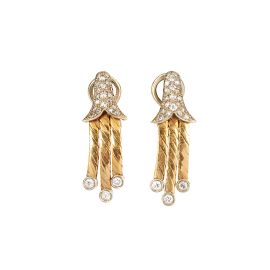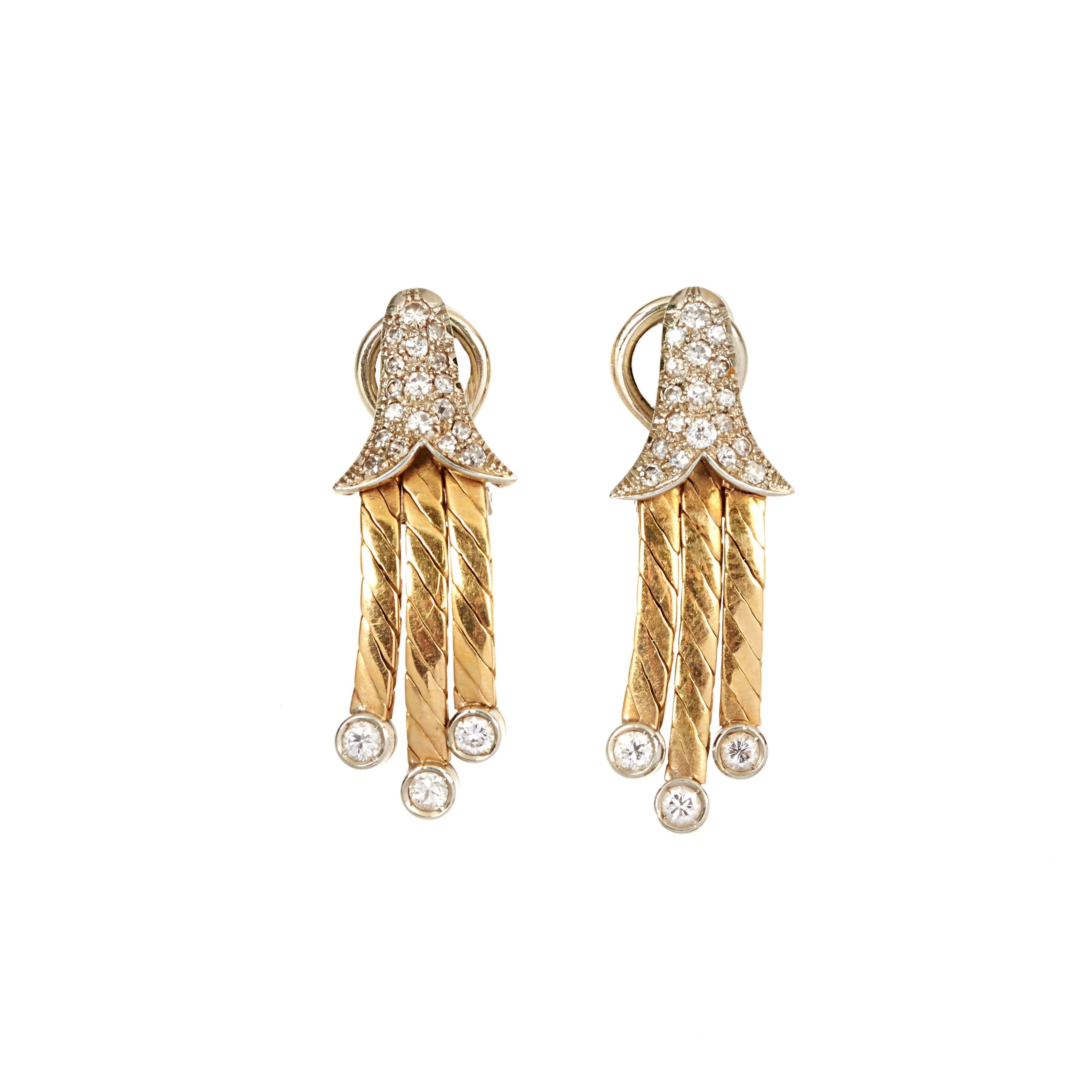 in oro giallo e bianco 18kt, ciascuno composto da tre nastri pendenti, impreziositi da diamanti taglio brillante e vecchio per ct 0.50 circa, chiusura a clip con perno, dim. cm 1x3,5, gr. 10 complessivi