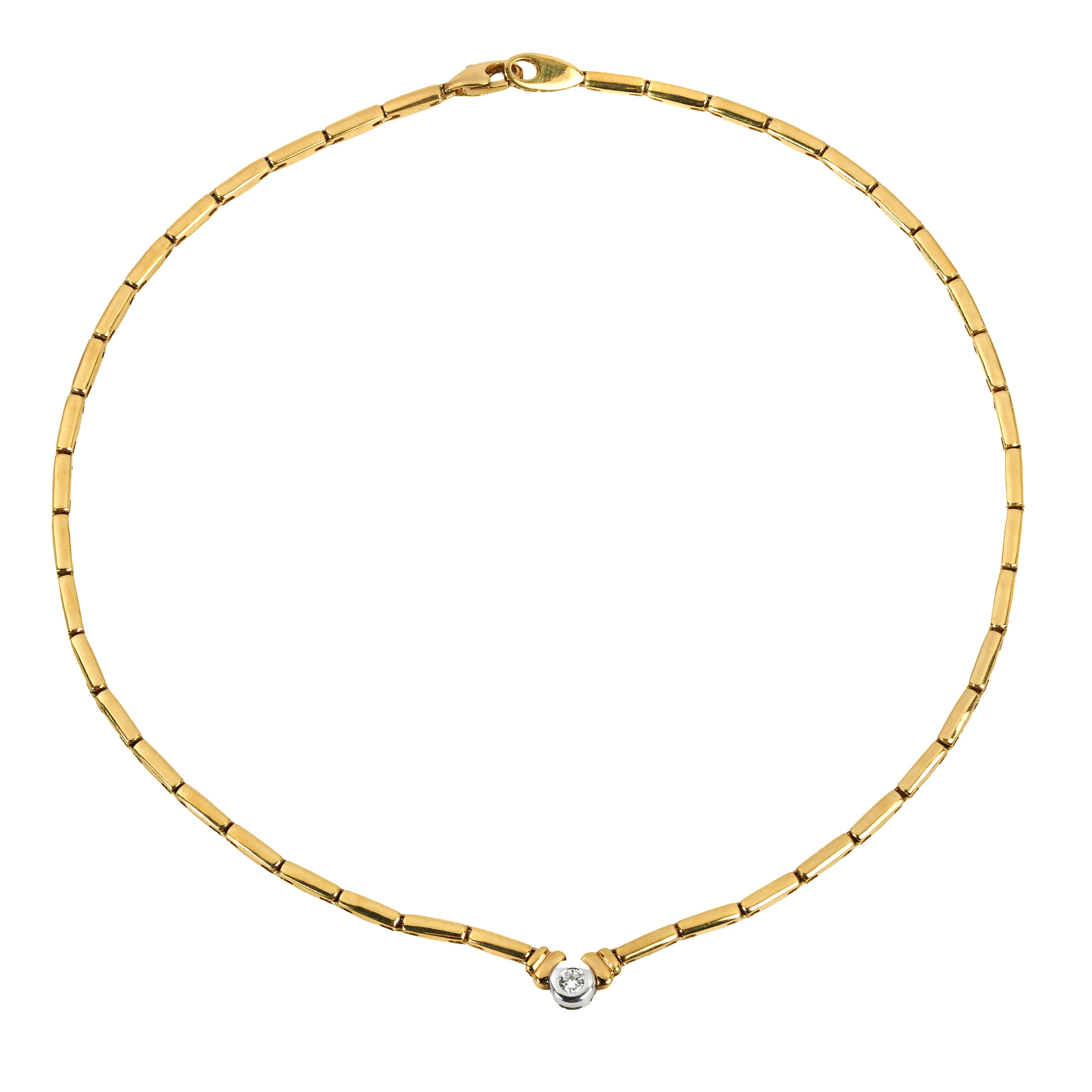 in oro giallo e bianco 18kt, composta da una serie di maglie concatenate rettangolari, con diamante centrale taglio brillante di ct 0.20 circa, punzone 750, lungh. cm 41, gr. 21