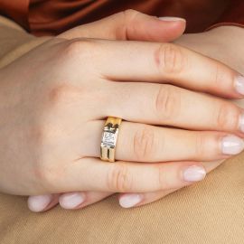 in oro giallo e bianco 18kt, fascia geometrica con diamante taglio princess di ct 0.35 circa, punzone 750, mis. 21/61, gr. 9