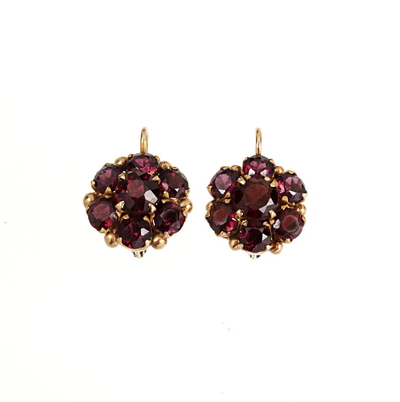 in oro giallo 18kt, impreziositi da granati sfaccettati, gr. 13, dimensioni cm 1,4x1,4 circa