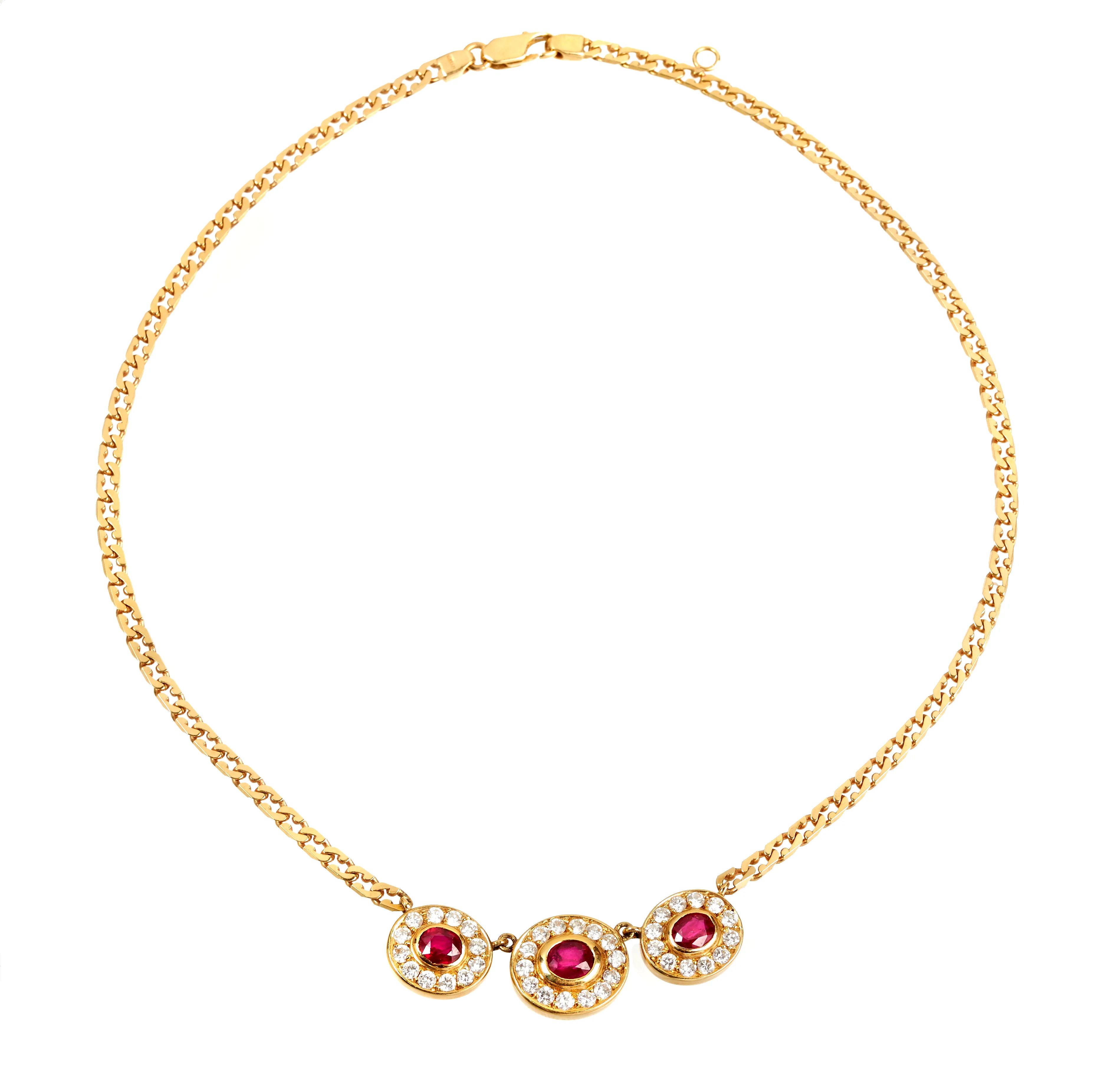 in oro giallo 18kt, impreziosita da tre rubini di forma ovale per ct. 1,90 circa e diamanti per ct. 1,10 circa, punzone 750 e del fabbricante, gr. 21 circa, lunghezza cm. 36,5