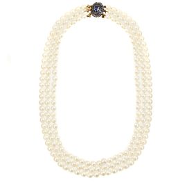 realizzata a tre fili di perle di mm 7 circa, fermatura in oro e argento decorata in smalto blu con pietra semipreziosa centrale, punzoni