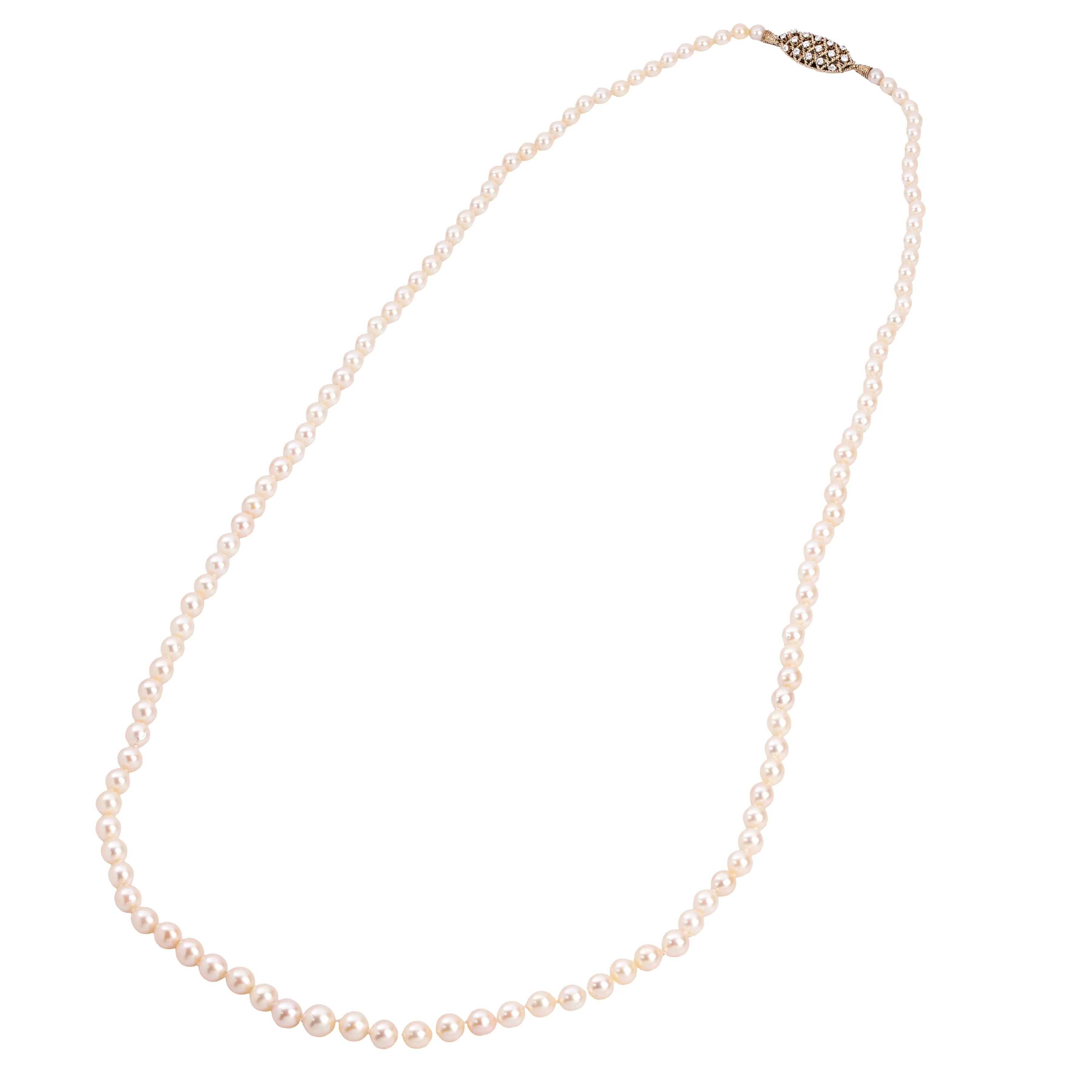 realizzata ad un filo di perle leggermente digradanti di mm 9-5 circa, fermatura in oro bianco 18kt impreziosita da diamanti taglio brillante per ct 0.60 circa, punzoni 750 e del fabbricante, lungh. cm 103, gr. 85