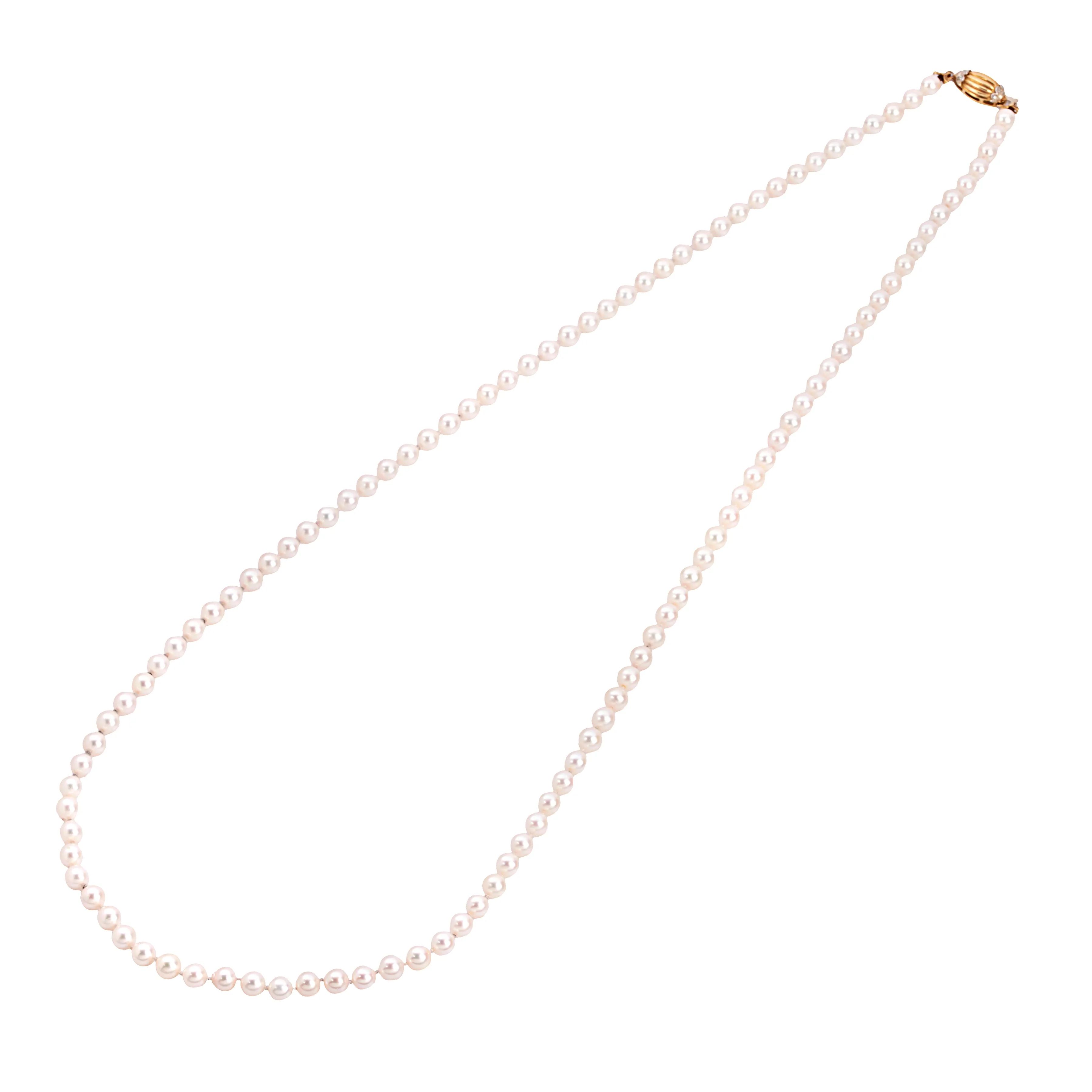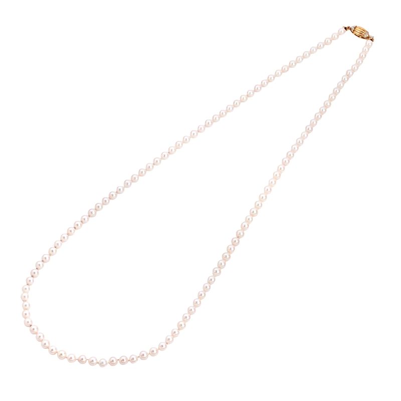 realizzata ad un filo di perle di mm 7 circa, fermatura in oro giallo e bianco 18kt con diamanti taglio huit huit, punzone 750, lungh. cm 98, gr. 76