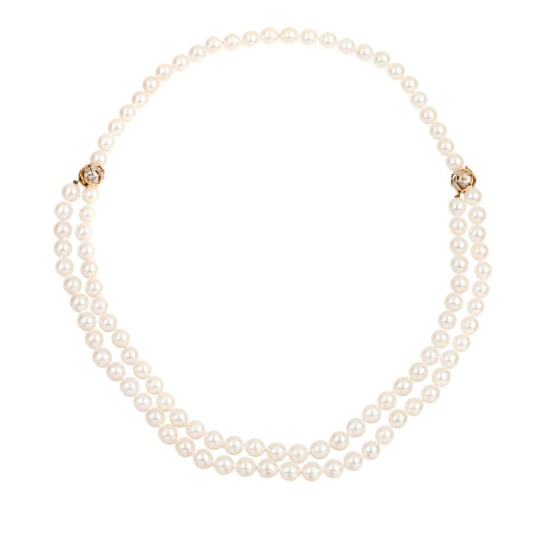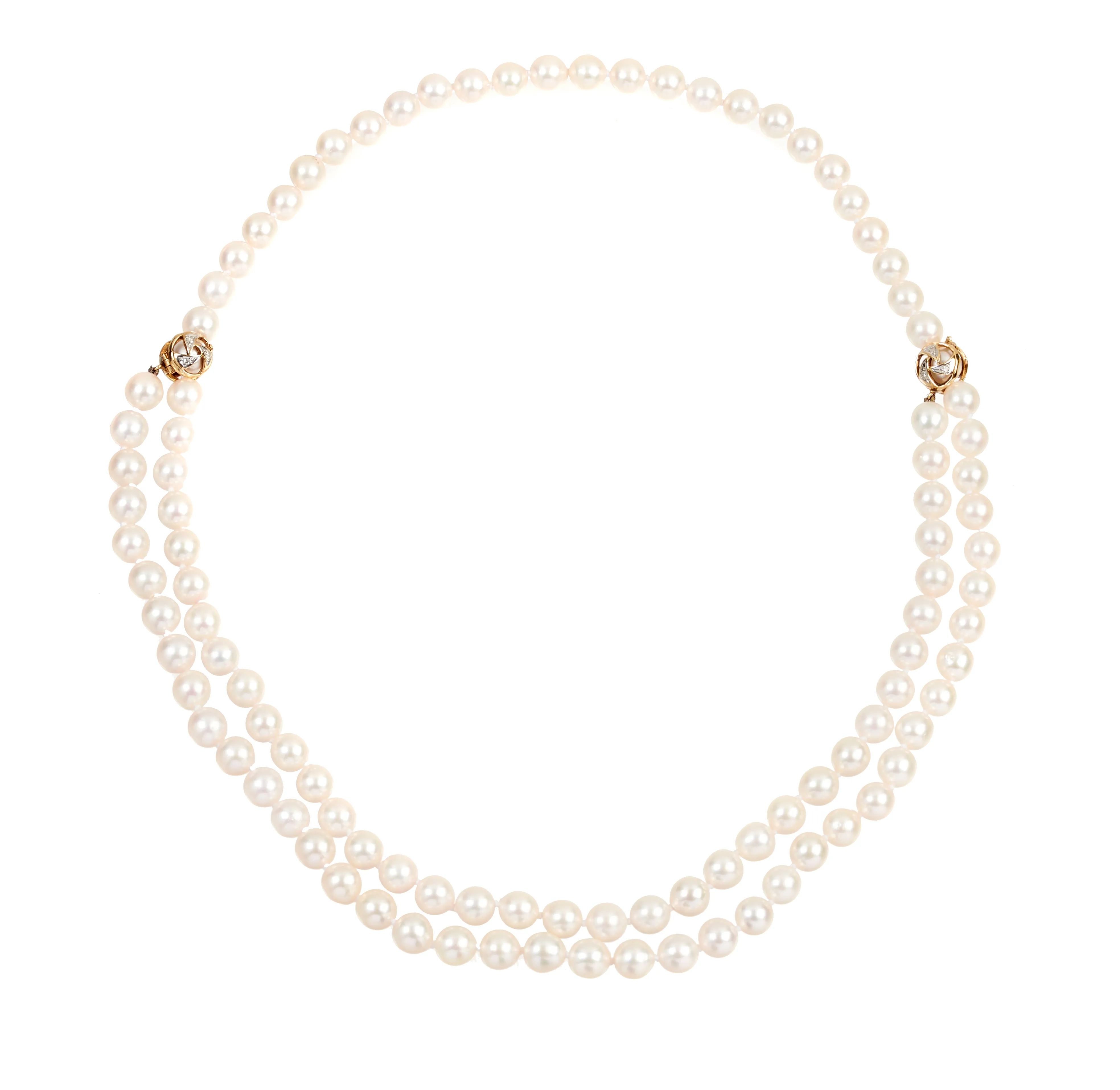 realizzata a un filo d perle di mm 7,5 circa con due fermature in oro 14kt impreziosite da piccoli diamanti taglio huit huit, cm 90 circa, gr. 73 circa