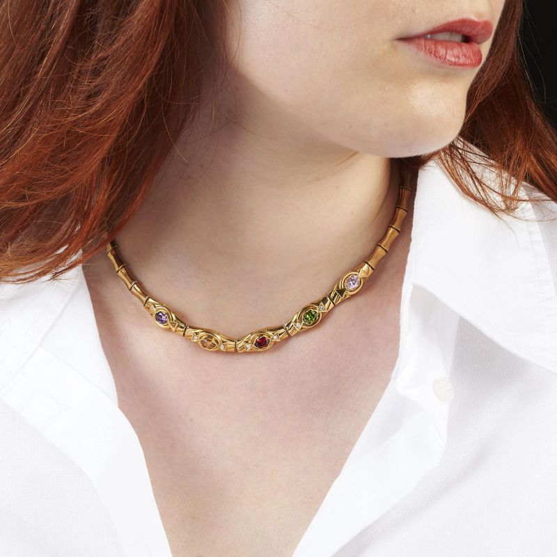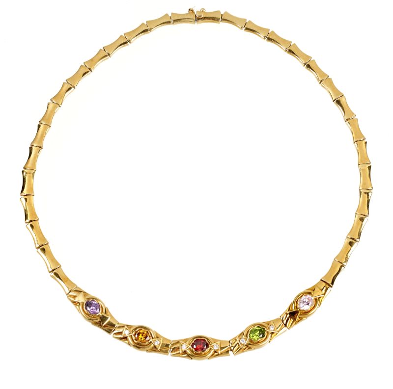 in oro giallo 18kt, impreziosita da cinque pietre semipreziose e diamanti, punzone 750 e del fabbricante, cm. 40, gr. 35