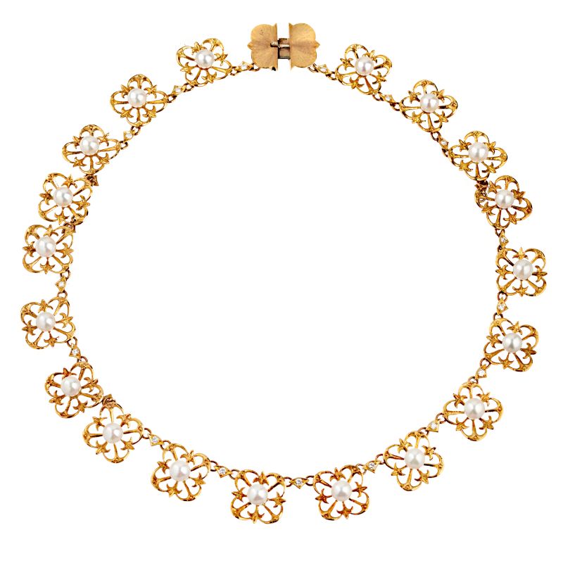 in oro giallo 18kt, composta da una serie di maglie concatenate a forma di fiori stilizzati, impreziosita da perle di mm 6 circa e diamanti taglio brillante per ct 1 circa, firmata "Penko", punzoni 750 e del fabbricante, lungh. cm 43, gr. 42