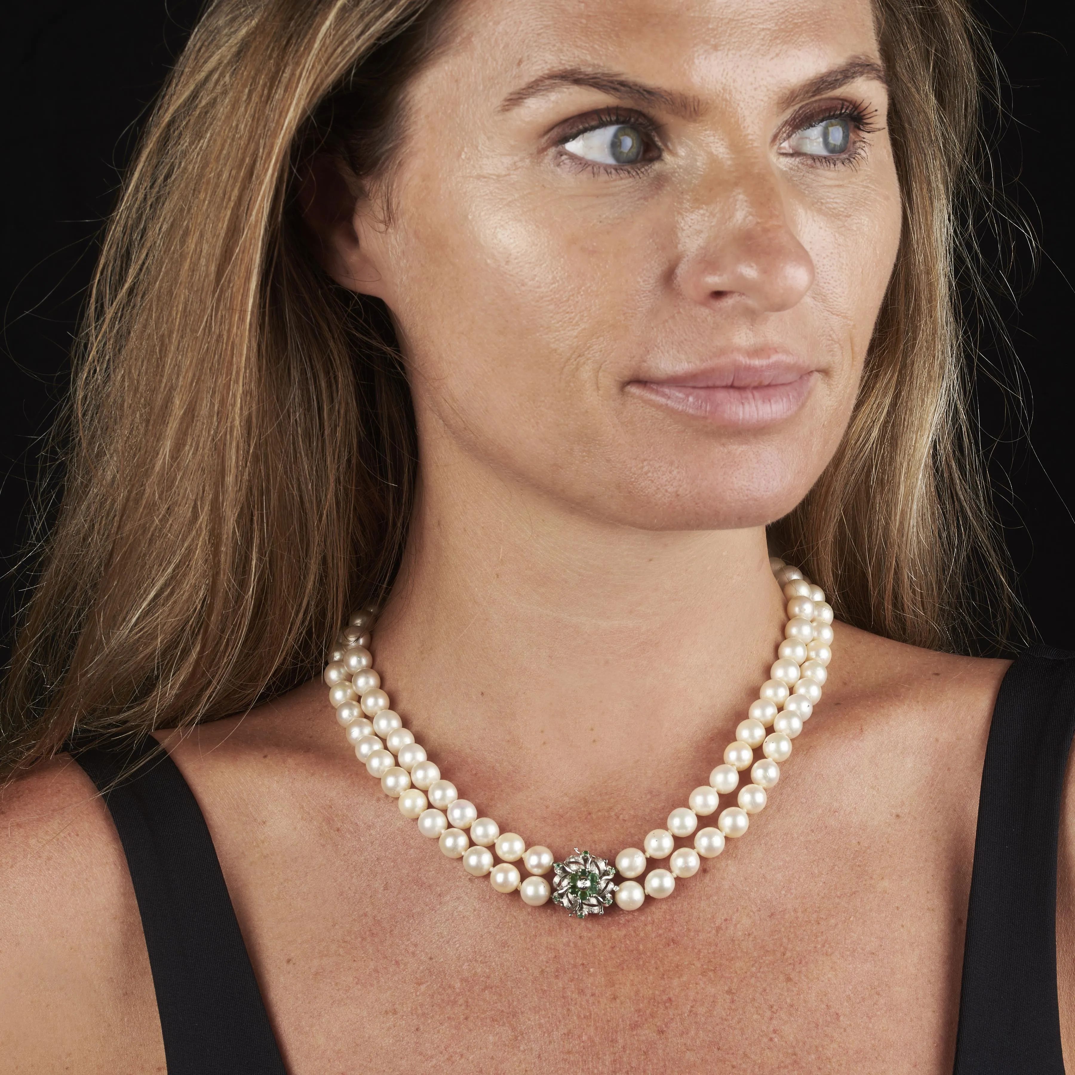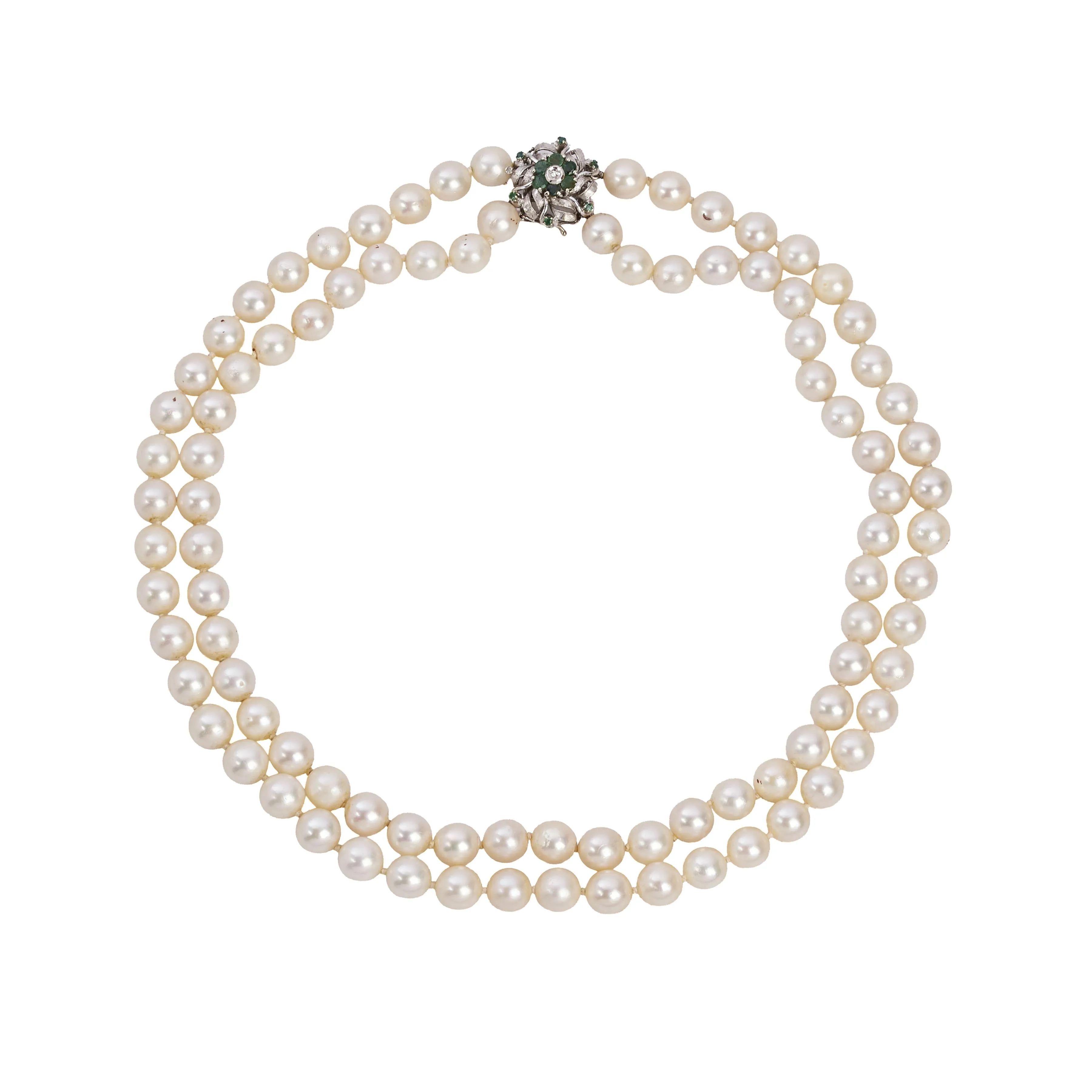 realizzata a doppio filo di perle di mm 8 circa, fermatura in oro bianco 18kt, impreziosita da smeraldi taglio rotondo per ct 0.50 circa e un diamante centrale taglio huit huit, punzone 750, lungh. cm 44, gr. 89