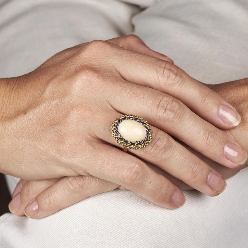 in oro giallo 18kt, impreziosito al centro da un corallo rosa taglio cabochon circondato da piccole foglie in smalto blu (difetti), punzoni 750 e del fabbricante, mis. 16/56, gr. 7