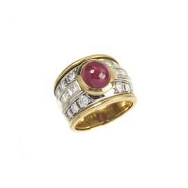 in oro giallo e bianco 18kt, impreziosito al centro da un rubino taglio cabochon di ct 3.50 circa, circondato da diamanti taglio brillante e carré per ct 1.90 circa, mis. 15/55, gr. 12