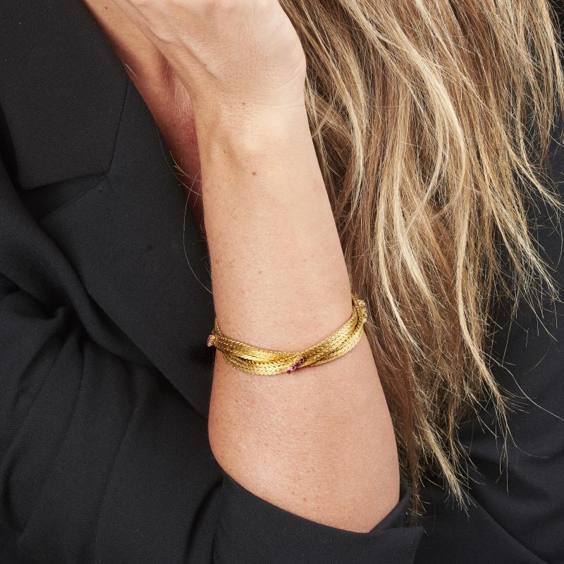 in oro giallo 18 kt, maglia a spiga schiacciata, impreziosito da piccoli rubini (uno mancante), punzoni dell'oro e del fabbricante, lung cm 19, gr 50 circa. Corredato di scatola.