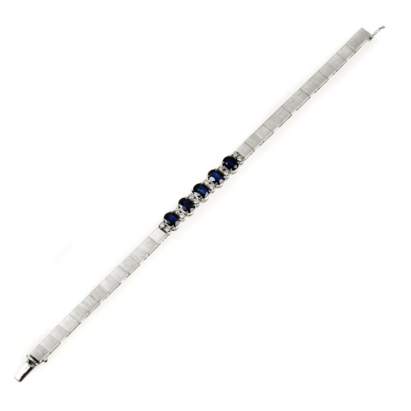 in oro bianco 18kt, impreziosito da cinque zaffiri per ct. 4 circa complesivi e diamanti taglio brillante per ct 0.50 circa, punzone 750, cm. 17,5, gr. 22