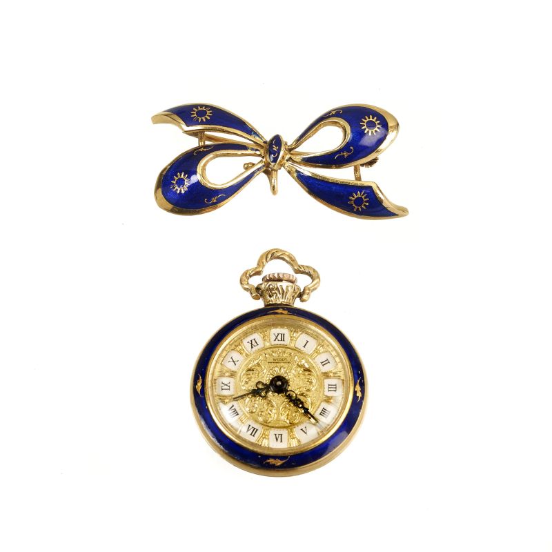 in oro giallo 18 kt e smalto blu, quadrante marcato Weber, orologio e spilla marcati 750, orologio non funzionante, diam. orologio 25 mm, gr 21 circa